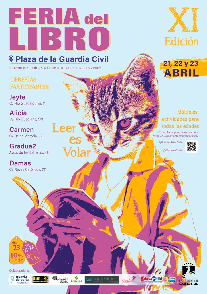 El Ayuntamiento de Parla, a través de la Concejalía de Cultura y en colaboración con el Centro de Iniciativas Empresariales, invita a las vecinas y vecinos a participar en la XI Feria del Libro de Parla que se celebrará desde el 21 al 23 de abril. Este evento incluye un extenso programa de actividades culturales abiertos a toda la ciudadanía. Se desarrolla en 3 sedes: la Casa de la Cultura, el Centro Cultural Almudena Grandes y la Plaza de la Guardia Civil.